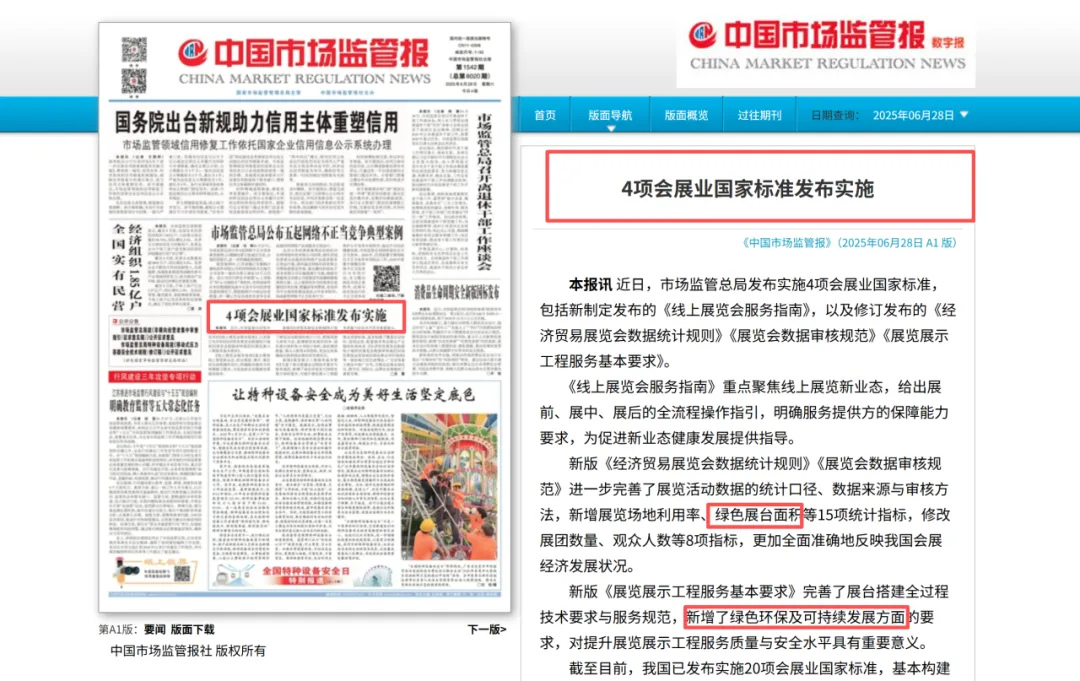 国内市场也在推动绿色低碳从可选项变为必选项。2021年,《关于加快建立健全绿色低碳循环发展经济体系的指导意见》明确提出“推进会展业绿色发展”,并推动行业标准《环保展台设计制作指南》实施。2023年,国家标准《绿色展览运营指南》落地,构建起展览绿色运营的长效机制。2025年,市场监管总局发布实施4项会展业国家标准,修订版《展览展示工程服务基本要求》新增了绿色环保及可持续发展方面的要求。