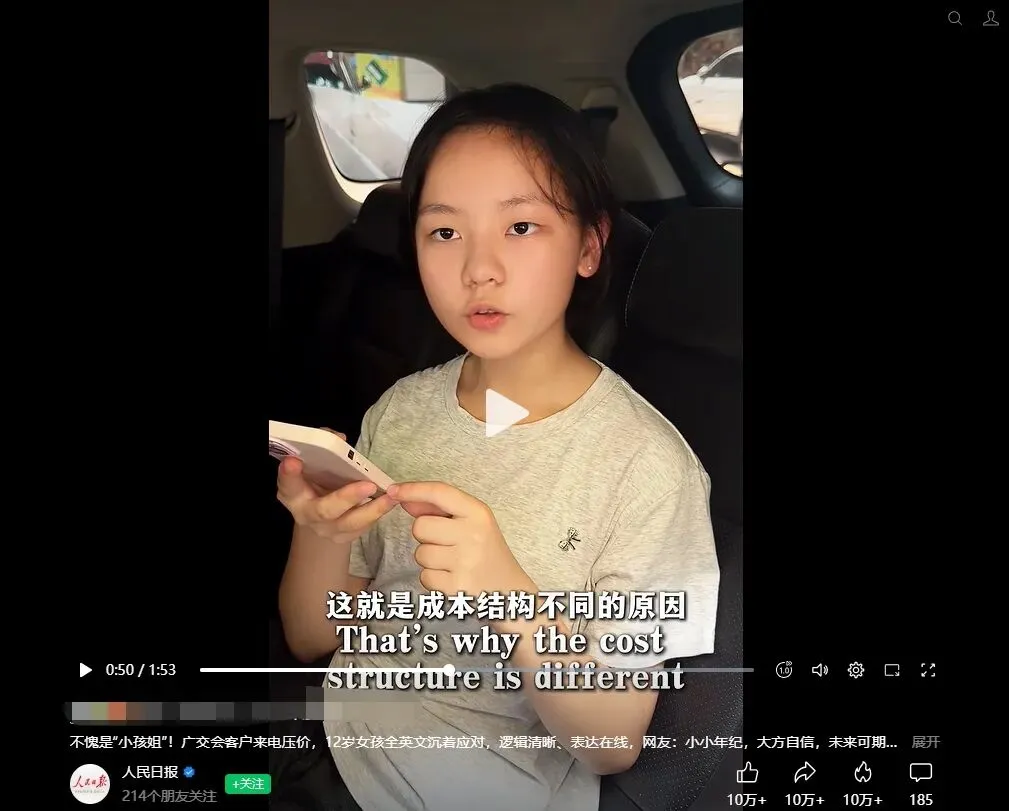 “Hello, we reviewed your quotation again. The total price is still too high.”4月26日,人民日报视频号发布了一条主题为“广交会客户电话压价,13岁小孩姐全英文应对”的视频,引起广泛关注。