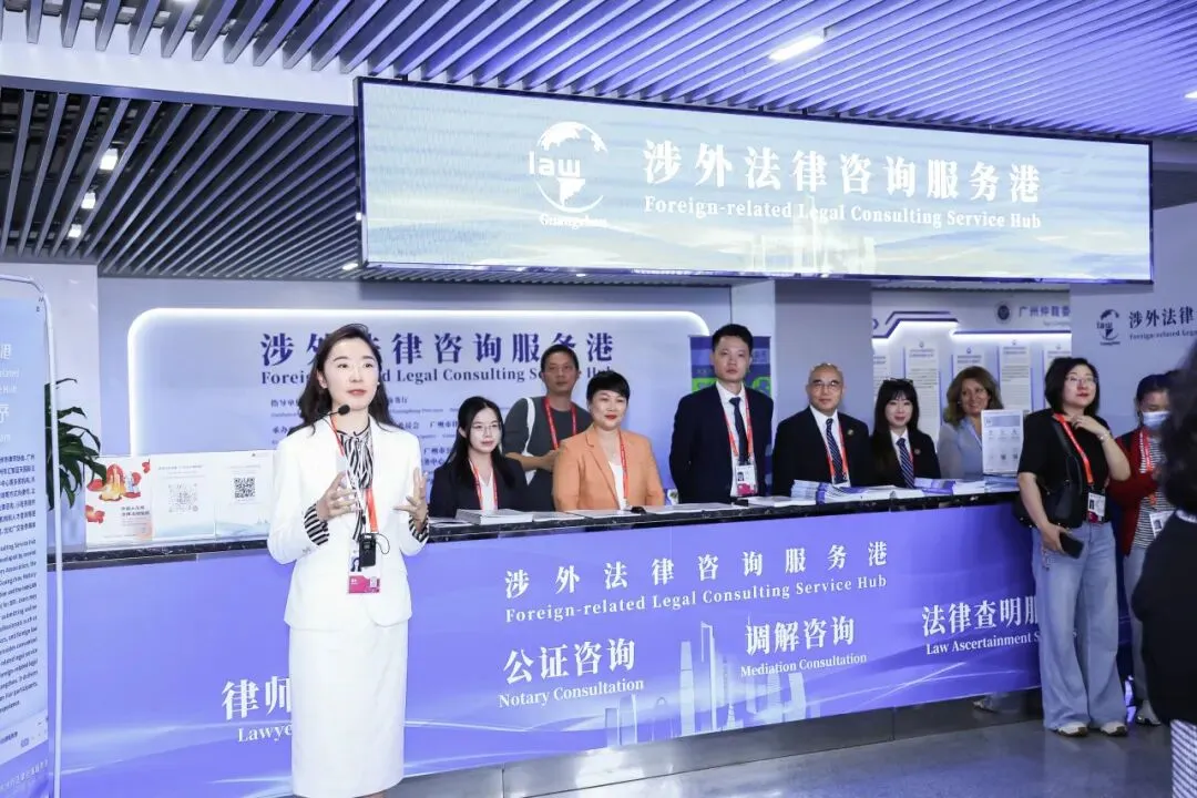 活动结束后,与会嘉宾参观了广交会涉外法律咨询服务港。该平台整合律师、公证、仲裁、调解等资源,提供现场与线上结合的咨询服务,并设有专门面向大湾区及跨境业务的服务窗口。