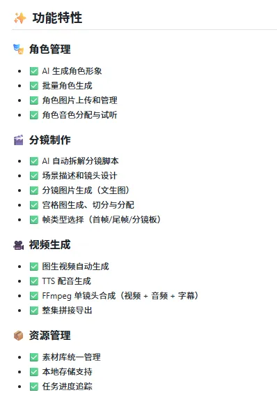 项目自己写得更直,剧本生成、角色设计、分镜制作、视频合成,全都串起来了。
