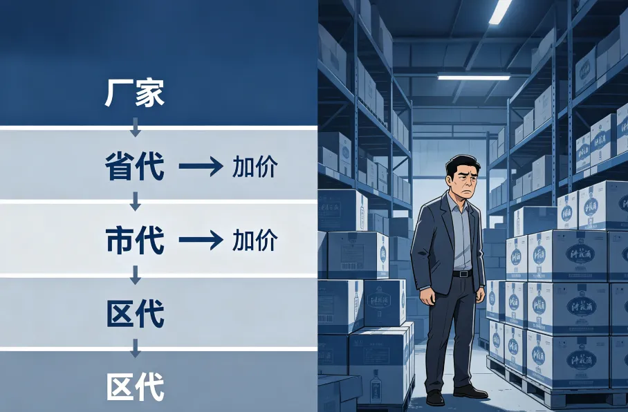 传统白酒靠着:厂家-省代理-市代理-区代理等等,每一层都需要从下一层当中赚取差价,厂家也为了冲销量,经常强迫下级压货,导致资金流紧张。