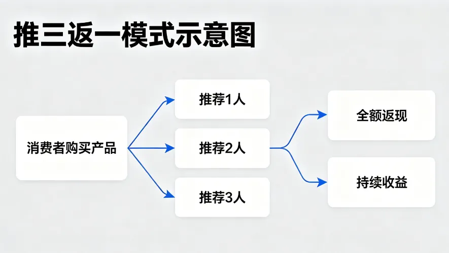 消费者通过自己购买一款核心产品,推荐三个用户同样消费等价产品,即可全额返本,回本之后还能持续赚取收益。