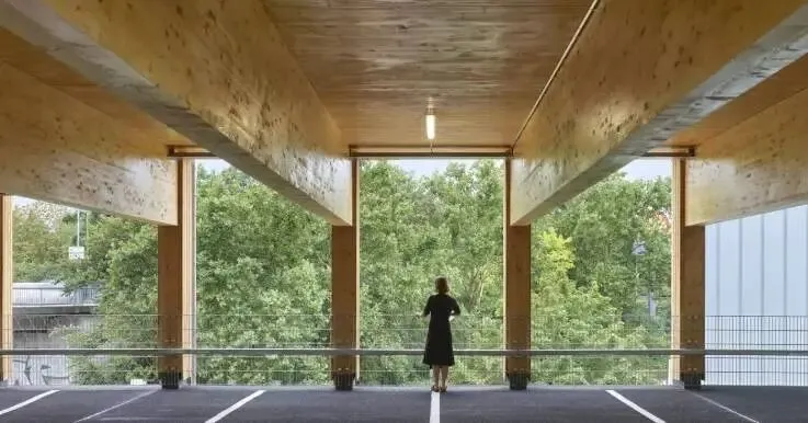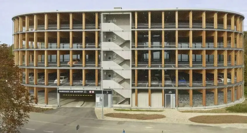 它是如何运作的?赫尔曼+博世建筑事务所(herrmann+bosch architekten)没有采用传统的钢结构或混凝土结构,而是设计了一种开创性的结构,主要由交叉层压木材天花板和胶合木支撑构成。只有坡道天花板和楼梯间出于结构和防火的考虑才采用混凝土。天花板表面覆盖着一层耐用的沥青。由于场地面积有限,停车场的椭圆形设计引人注目。然而,这看似不足之处反而成为了一种优势:长达16米、重达2.5吨的屋顶梁出于结构考虑呈星形排列,从而实现了无柱停车位,提高了空间利用率,并可根据需求调整停车位宽度。停车场的建造工艺也十分简便,所有木结构构件均预制后运至施工现场,并采用简易的插接系统进行组装。这确保了施工周期短,从而实现了高性价比。