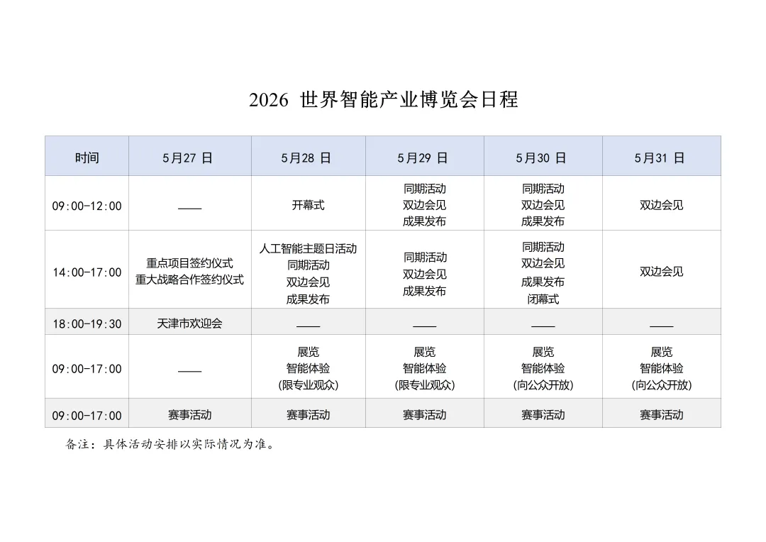 2026 世界智能产业博览会由天津市人民政府、重庆市人民政府共同主办,将于 5 月 28 日至 31 日在国家会展中心(天津)二期举办。本届博览会深入贯彻习近平总书记关于人工智能、数字经济等有关重要论述、对天津工作的重要指示要求和致世界智能产业博览会的重要贺信精神,认真落实国务院关于深入实施 “人工智能+ ”行动的意见,秉持 “高端化、国际化、专业化、市场化”理念,以 “智行天下 能动未来”为主题,突出具身智能年度热点,全方位展示智能科技领域新技术、新产品、新场景,深层次推动人工智能技术突破、场景落地、生态构建,为加快建设现代化产业体系、推动人工智能与实体经济深度融合提供持续动能。