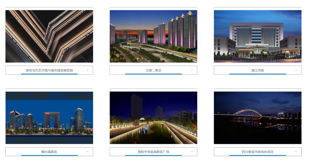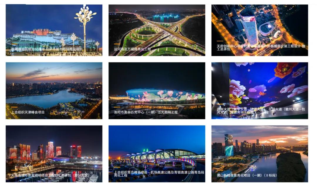 经典案例:拉萨市城市照明亮化、洛阳市奥林匹克运动中心泛光照明工程、大连市城市景观照明、佛山新城夜景亮化。