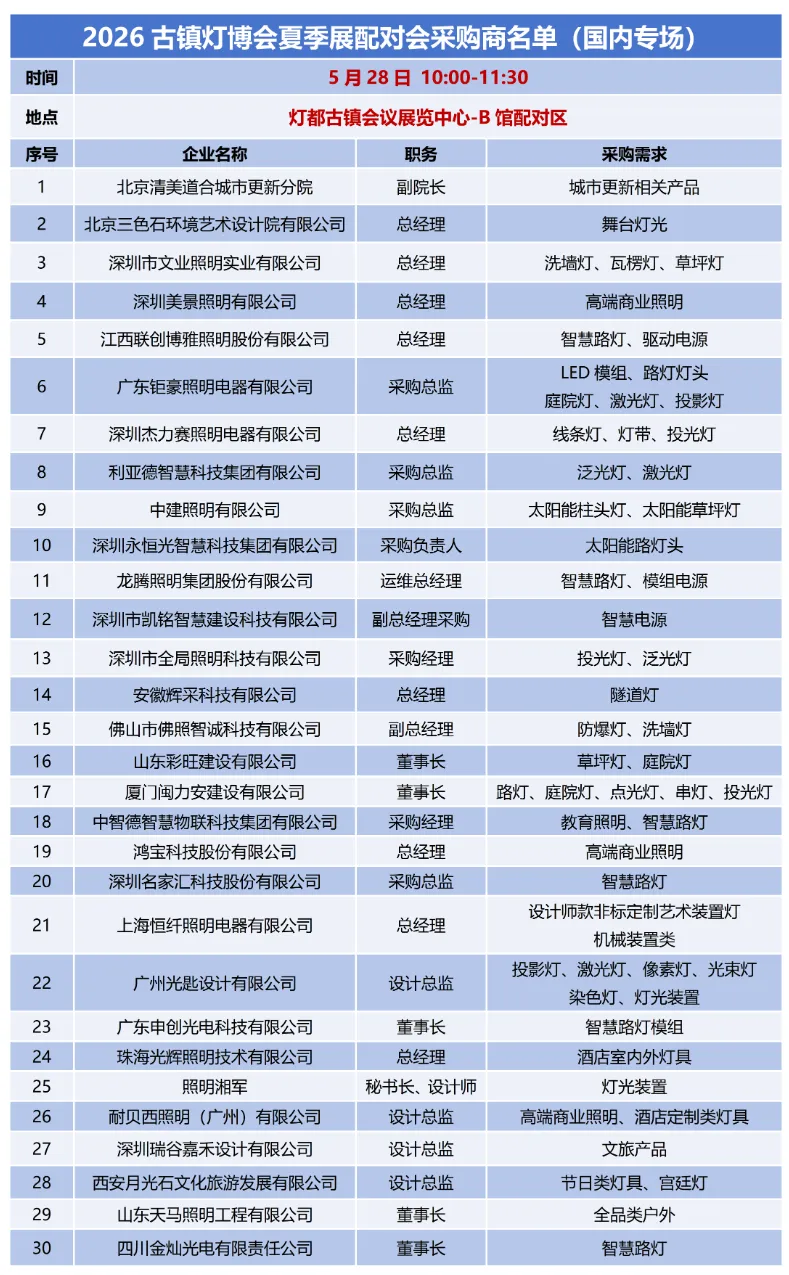 今天为大家揭露的是5月28日国内专场的一手消息,活动特邀文旅夜游、智慧工程、商业照明、城市更新等领域优质采购商,齐聚灯都古镇会议展览中心B馆配对区,到场采购商均为企业核心决策人,具备清晰采购规划与明确合作需求。部分重点采购商信息如下: