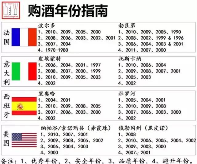 (4)避开年份:坏年份,葡萄生长得不好,酿出的葡萄酒可能缺少果香、酸度或单宁。所以,购酒时切记避开这些年份的酒。