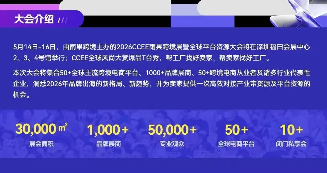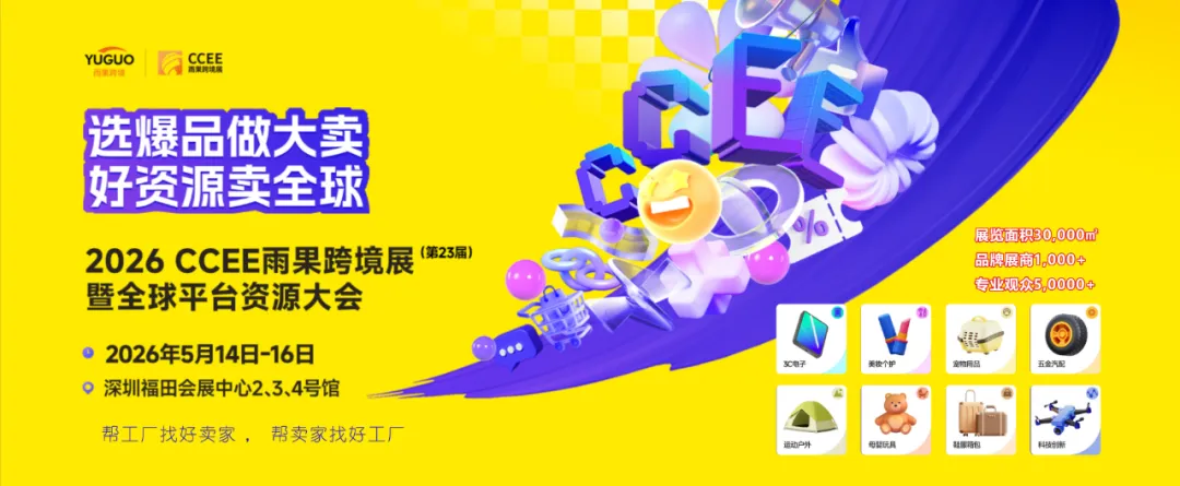 5 月 14—16 日,深圳会展中心(福田),2026 CCEE 雨果跨境展,链接全球商机,赋能品牌出海。无论是深耕行业的老兵,还是刚入局的新手,这场盛会都是你拓资源、找方向、抢订单的不二之选。