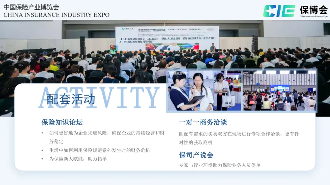 保险行业作为社会减震器和经济稳定器,在国民经济和社会生活中发挥着越来越重要的作用。近年来,中国保险业保持了增长态势,持续为中国经济贡献力量,赋能经济社会的发展。随着保险3.0时代的到来,专业化转型升级已经是未来发展的必然趋势。如何在激烈的市场竞争中,借助科技的力量与专业的力量,引进创新的项目技术、引入创意的工具礼品,驱动组织与业务的均衡发展,这已经成为各家保险公司关注的焦点。中国保险产业博览会作为国内首个保险产业的专业性展会,聚集保险公司、保险平台、医疗、养老、礼品、文旅、科技、教培等多个领域,赋能各家保险公司业务发展与组织建设,帮助广大中小企业链接客户,同时也为近万名保险从业人员提供创新服务,促进保险行业从产品驱动转向服务驱动。共同见证保险行业的不断发展。