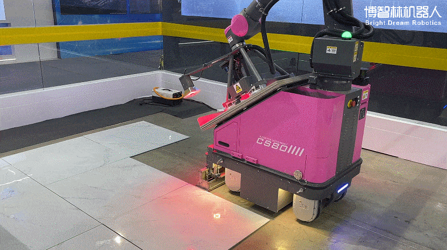 博智林展位上最受瞩目的“大明星”——地砖铺贴机器人CS80正在演示作业。只见它使用着四个吸盘,吸着地砖缓缓向地面移动,利用视觉技术与其他砖块进行对齐。将800x800的又大又重的地砖铺贴得又快又好。铺贴一块地砖只需要十余秒,效率与质量让围观群众竖起大拇指。