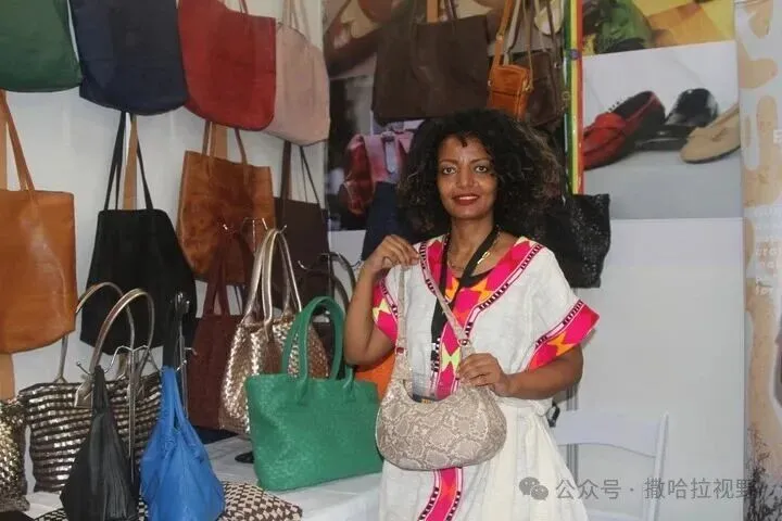 4月23日,在津巴布韦布拉瓦约举行的第66届津巴布韦国际贸易博览会上,一名埃塞俄比亚参展商展示皮革制品。 新华社发(塔法拉摄)
