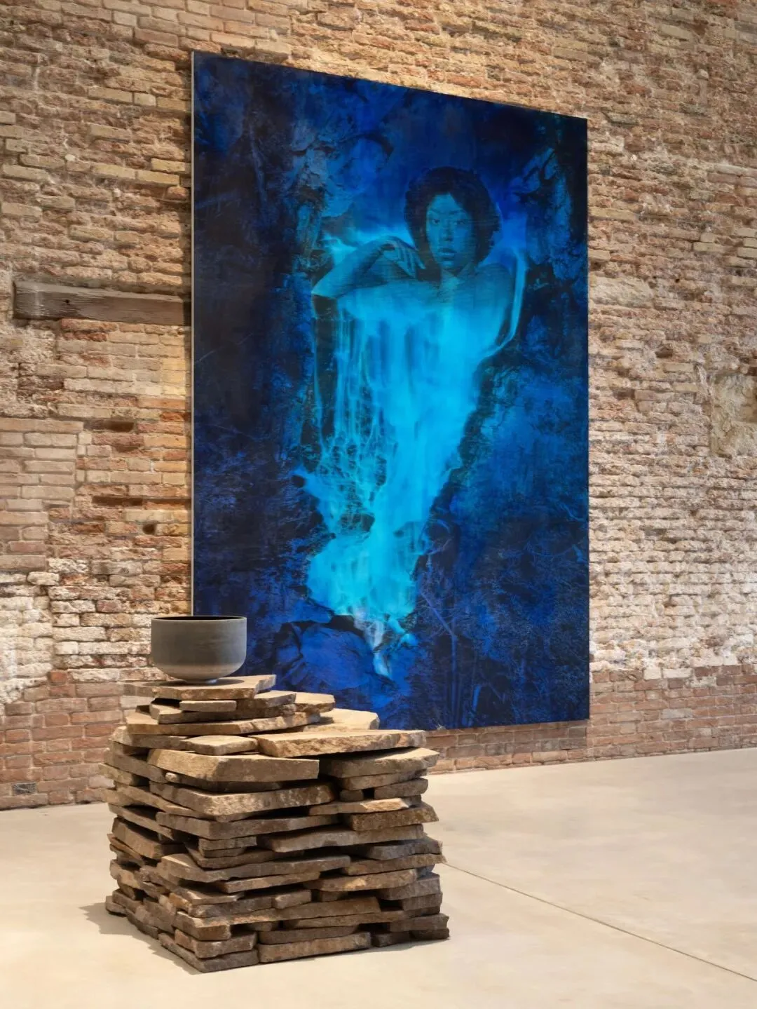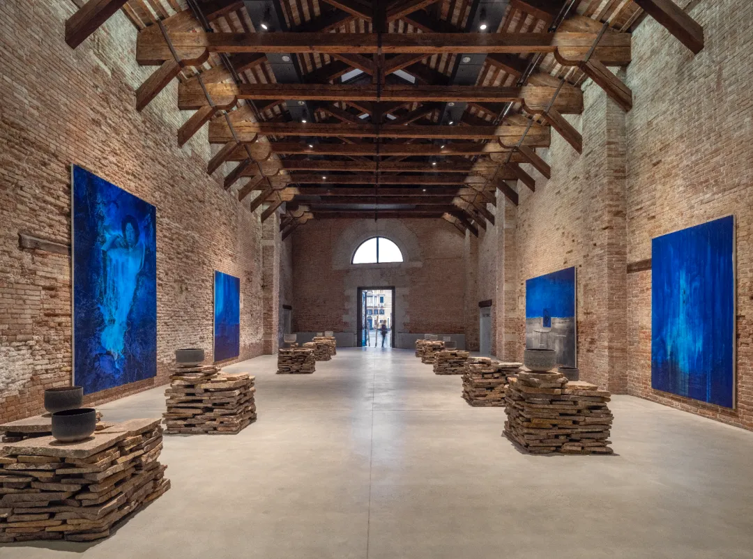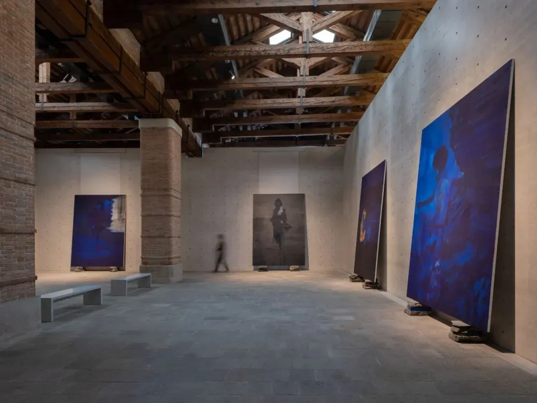 展览围绕三大核心单元展开。首先呈现的是一组结构密集的作品,其中充满神秘人物、历史回响与政治张力,唤起动荡的意象。这些作品构成了一个不宜栖居且不断变动的环境舞台,被弥散的力量所穿行。随后,一系列源自探险档案重构的北极全景展开,以夜蓝与霜灰的色调铺陈,使这些幽暗景观呈现出一种悬置的梦境气质。在威尼斯潟湖边缘,它们仿佛悬浮于两种状态之间——既对自然元素保持渗透,又被随时可能消散的幽灵般存在所占据。最后,在安藤忠雄设计的“立方体”(Cube)空间中,一组宏伟而神秘的女性形象构成的画廊直面观者,呈现身份的复杂性与再现的暧昧性。