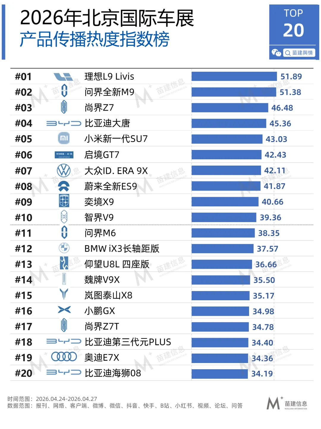 TOP20车型:新能源占比高达90%以上,自主品牌占据绝对主导,SUV车型占比约70%,轿车占比约20%,MPV仅智界V9一款入围。增程式(含增程/纯电双动力)车型占比达45%,纯电车型紧随其后,插混及多动力路线车型亦有布局,动力形式呈现多元化竞争态势。 华为生态系强势领跑:问界、尚界、智界、启境、奕境五大品牌合计7款车型入围,占比超三成,覆盖轿车、SUV、MPV全品类,展现出华为智能汽车生态在多品牌矩阵下的系统性竞争力。 超大型豪华SUV进入平价时代:理想L9 Livis、问界全新M9、蔚来全新ES9、比亚迪大唐、仰望U8L等旗舰级大型SUV集体亮相,车身长度普遍突破5米、轴距超3米,内饰与智能配置对标百万级豪车,部分车型起售价下探至22万元区间,将高端大型六座SUV拉入主流家庭购车预算。 轿车赛道热度不减:尚界Z7、小米新一代SU7等纯电轿车热度不俗,启境GT7以增程/纯电双动力切入运动轿车细分市场,尚界Z7T进一步扩充轿车产品线,表明轿车品类在SUV浪潮下仍具备强劲的市场感召力。 合资品牌借电动化突围:BMW iX3长轴距版与奥迪E7X两款纯电车型成功入围,合资品牌通过深度本土化与电动化转型重新争夺市场话语权,但整体热度仍被自主品牌大幅领先。