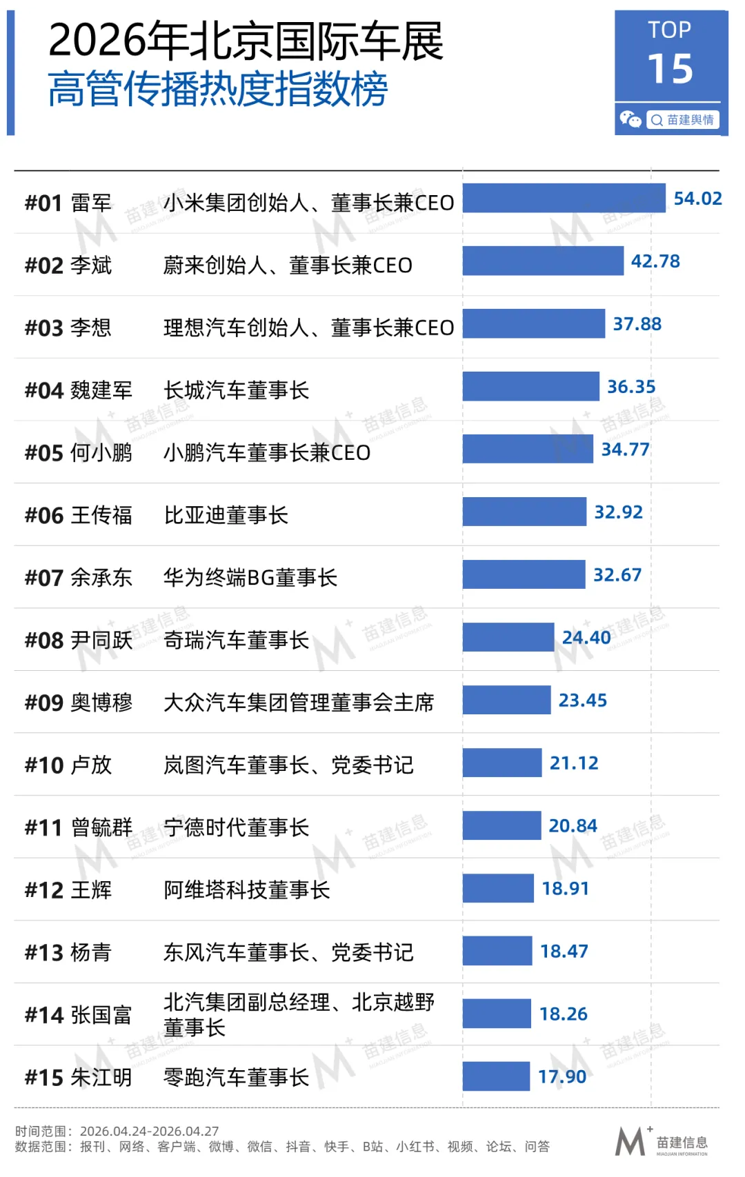 自主品牌全面主导,比亚迪系矩阵效应显著:品牌热度TOP20中,自主车企品牌占据13席,占比达65%。比亚迪断层登顶,旗下方程豹、腾势同步入围,形成"主品牌+高端越野+豪华"的多层级品牌矩阵。华为乾崑紧随其后,叠加问界与鸿蒙智行,华为生态系合计3个品牌上榜,展现出"不造车但无处不在"的平台型影响力。 供应链与智驾企业破圈入场,产业话语权重构:宁德时代高居品牌榜前五,超越多数整车品牌,反映出电池巨头从幕后走向台前的品牌势能;智驾方案商MOMENTA跻身TOP20,标志着智能驾驶技术已成为品牌热度的核心驱动力之一。供应链与科技企业的品牌化,正在重塑车展的流量分配逻辑。 外资品牌坚守阵地,本土化深度决定热度上限:宝马、奥迪、丰田三大外资品牌入围,但整体热度仍被自主品牌大幅压制。外资品牌的"反击"路径已从展示全球车型转向在中国重建研发与软件能力,能否真正实现本土化重构,将决定其在下一阶段竞争中的站位。
