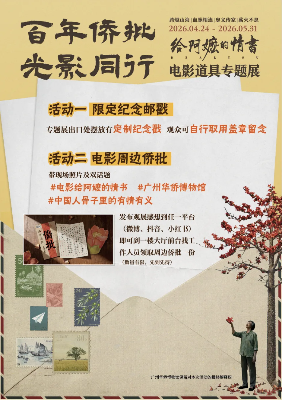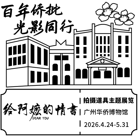 展览开展期间(2026年4月21日至5月31日),带现场照片及双话题:#电影给阿嬷的情书#广州华侨博物馆#中国人骨子里的有情有义等话题发布观展感想到任一平台(微博、抖音、小红书)即可到一楼大厅前台找工作人员领取周边侨批一份。(数量有限,先到先得)