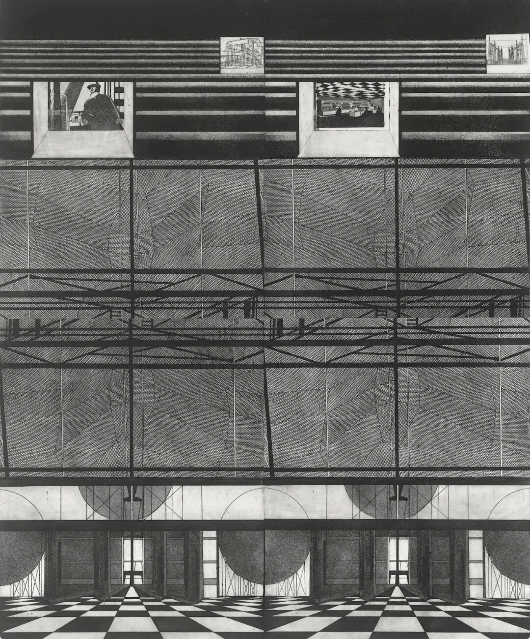 陈海燕如是梦,纷然无断。从1993年开始,海燕开始铜版创作。铜版的创作方法与木版不同,她舍弃了文字,以更抒情的方式画蝴蝶、画海洋。《梦1996年11月22日·画雀》中,三只喜鹊在笼中欢唱,一群飞鸟翩然飞过。梦的叙事在这里有了很大的变化,那种自在的构成不是在文字的铺陈中完成的,而是在图形与图形中蝶变翻飞。图景的意味更完整,也更栩栩如生。接着,她的梦开始大型化。《梦 1999 年 5 月 19 日·窗口中的孔雀》,以四张大木 刻攒成一张大画。黑板中留着众多的刀痕。刀痕的荒原上堆塑着形状,累积成由某种斑驳的 因缘而生发的诗性。我们依然感受到重压之下的刀痕快味和生命诗意。