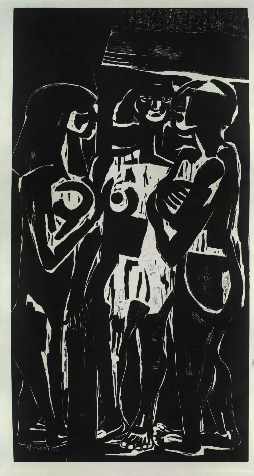 这是海燕才华横溢的时刻。她的“梦”骤变成一种构成生命和艺术的方法,这种方法最突出 的特点是构成的辨识度。它让文字形成一片云雨的境域,又让物形、人形碰撞出梦的现场,仿佛梦的本身正在被构成。这版与画上的“存在”,不仅与梦域中的人、物、生活、叙事、体验不可分离,也与那纷至沓来的点画、文字、图形不可分离。这是一种真正的直觉。它不是在刻写和重复梦的日记,而是直接以刻绘的方式在作梦,以刻绘的“纯直观显现”来生发梦呓,来取得梦的自明性,来让我们一道观照梦境本身。也就是说,这里显示出来的刀笔构成,是基于文图交错的更直接、更原始的方式。它将带出生命或生活中某种原始冲动的原形。这正是海燕的“梦”之魅的秘密,也是她撬动人心的“梦”之艺的真切内涵。