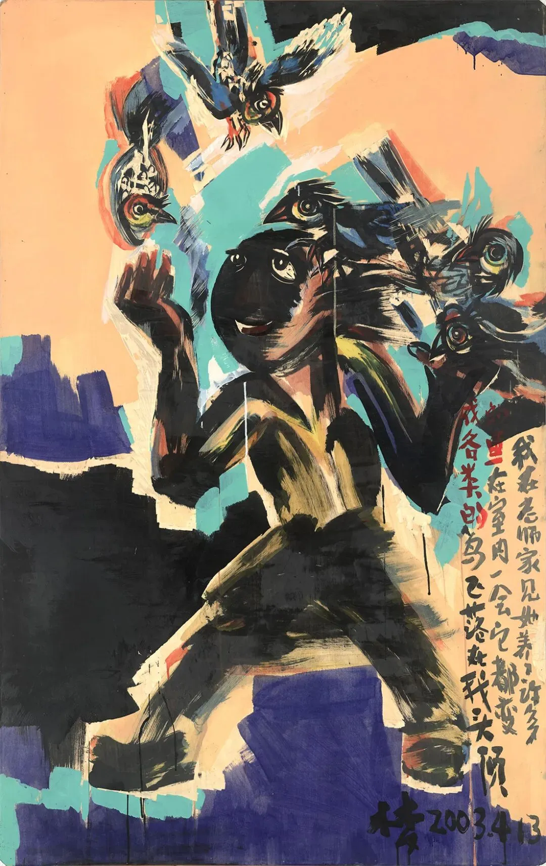 进入新世纪,陈海燕开始了她的大型绘画。在纸本上、在榉木板上,她大笔挥洒。《梦2001年5月24日·鹤女孩》,那仙鹤裸着双腿,与梦者相拥。二十多年的梦境已然为她打 开了一片无尽的天地。她要飞,她要在彩墨天地里飞。《梦2001年12月25日·风的话》中,黑色的笔触如风卷拂,有方有圆。“天似穹庐,笼盖四野。天苍苍,野茫茫。”海燕身 上的某种洒脱,从刀刃变成排列挥洒的线条,成了她反复读取的“风的话”。在《梦2001年9月24日·花盆底下的洞》中,她还以典型的木刻的方式,展现了她与芦荟花盆的奇遇。那兔子、那猴子、那些精灵都在倏然变化。她在笔记本中记录了这箴言一般的梦境。一系列涌生的惊悚故事推动着她,她身不由己,她万不得已,她要乘风而飞。在《梦2003年6月21日·看青龙》中,她看“一公一母粉绿色青龙在上下舞动”,而在画幅中,在暖色的背景 上,高高飞起的正是她自己。她画的不是梦的情节,而是发端于梦的情绪、梦的惊叹。《梦2003年4月13日·鱼变成鸟了》中,那追风少年如魔术师般在幻变,那人眼与鸟眼的交集,最能体现梦的荒诞性与真实性,最能闪现人性的悸动和光芒。这如风而动的挥洒,这鱼和鸟 的生动变迁,这荒诞的真实性,成了真正的梦,真正地在内心激情中生发出来的梦。