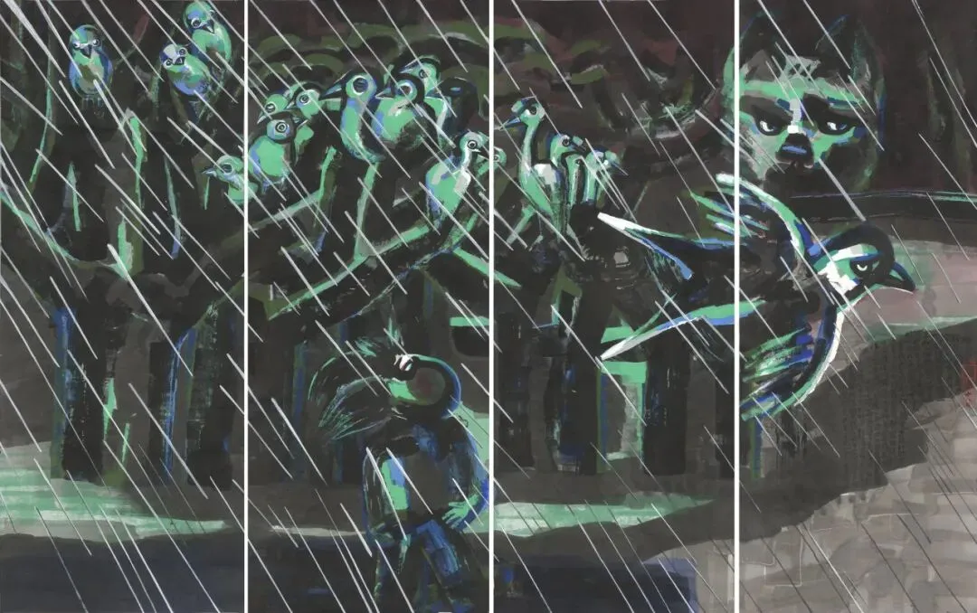 陈海燕近年大尺幅的“梦”,强烈而震撼。这源于她经年累月地录梦、绘梦、造梦,她已然将生命的主体性化变成了这梦境般的存在。她的梦呓悚奇,却不脱生活的痕迹。这也让我们 和她一道沉浸在家园叙事的梦境里。她的笔下呈现过西湖,呈现过公园导游,呈现过“月亮 从河中跳出”,呈现过“教堂与倒流的海水”。但在这里,她呈现的不是一般的、现世的湖,现世的景,而是充满想象和悚然的写意,是梦境特有的浪漫与风华。那图形随着大墨块、大彩笔上下翻飞,倏然耸动,仿佛被推进扁平化的梦境之中。这正是她作为一个奇女子的不凡本性的力量。2010年、2011年,陈海燕又刻了一批特大型的木刻原版,强烈的黑白色块叙述着夜猫,叙述着家中的水池,叙述着如虎的会议主持人,叙述着孵蛋的黑天鹅,叙述着扑向自己的黑山羊,叙述着来去匆匆的公鸡、母鸡......这荒诞的叙事,将惊悚的梦境变得凡常,又在生活的家园中发现危机四伏。这种转化,已经因为海燕自身的缘构,变得既熟悉,又震 撼人心。那粗犷的刻画、那铿锵的黑白跳跃,是梦是幻,我们如在其间。我们成为释梦者, 我们成为享梦人。