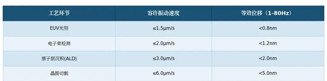 这些振动对半导体设备的影响,直接体现在关键尺寸(CriticalDimension,CD)的精度损失上。根据2023年SEMI国际标准修订案中的数据,不同工序对振动的容许指标如下: