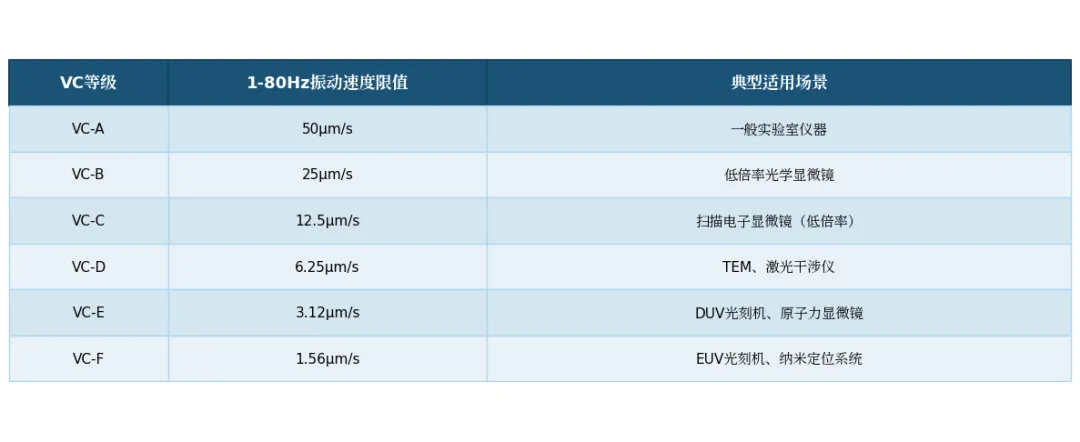 描述精密环境振动要求时,业界普遍采用"振动准则"(VibrationCriteria,VC)曲线体系。VC曲线将振动速度(均方根值,单位μm/s)作为评价指标,从VC-A(50μm/s,适用于一般仪器)到VC-F(1.56μm/s,适用于最高精度纳米加工设备)分为六个等级。