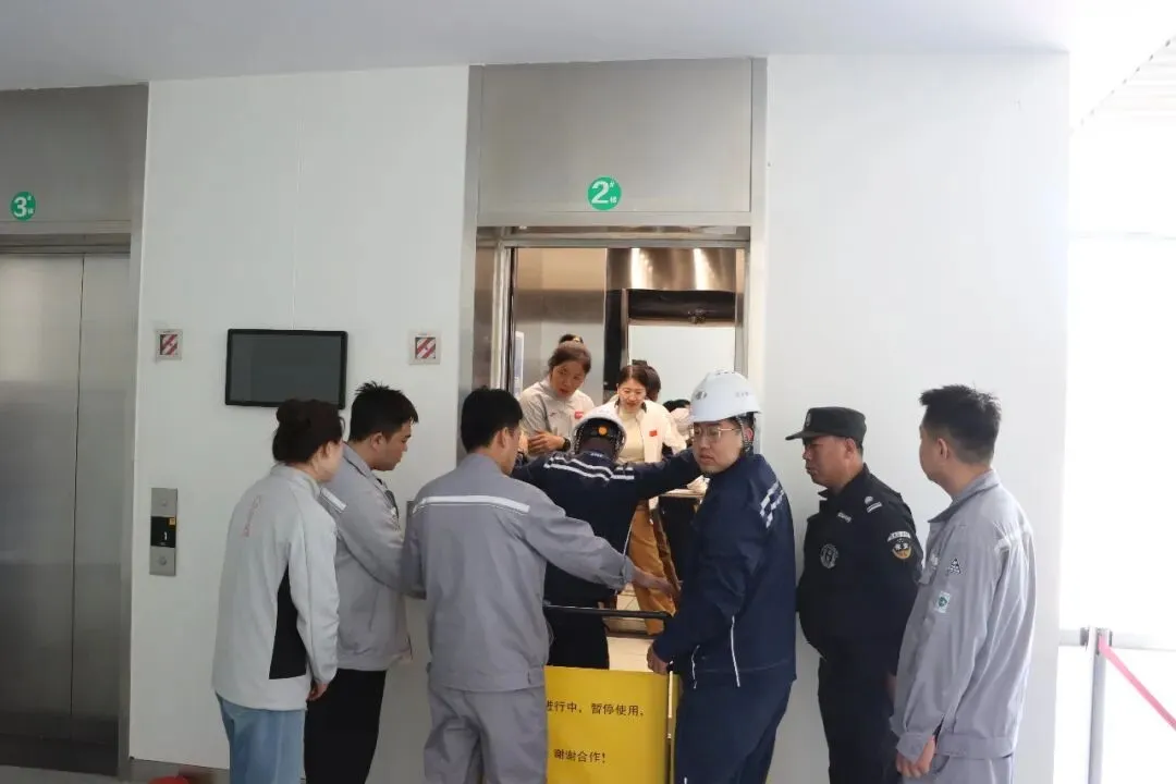 防溺水演练结束后,全体人员转场开展电梯困人处置演练。模拟电梯运行突发故障,2名“乘客”被困并通过紧急报警装置求救。安保监控室立即启动应急预案,通过对讲安抚被困人员、确认情况,同时通知工程组赶赴现场。工程人员规范救援,几分钟后成功解救被困人员并进行安抚。救援结束后,工程人员全面排查故障、完成维修,确认设备正常后撤除警戒标识。整个演练过程紧张有序,各环节衔接顺畅,充分检验了公司应对特种设备突发事件的快速响应能力与部门间协同作战水平。