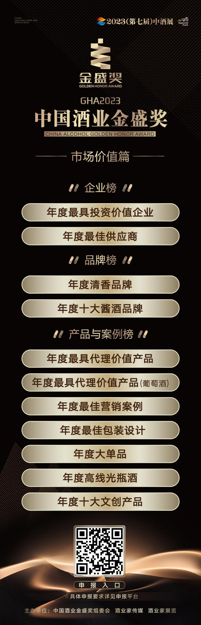 中国酒业金盛奖(市场价值篇)奖项面向国内外酒企、供应链企业及市场渠道进行奖项征集,欢迎企业踊跃报名、积极推荐,快速报名(建议使用电脑浏览器打开网址/或使用手机扫码进入申报系统):