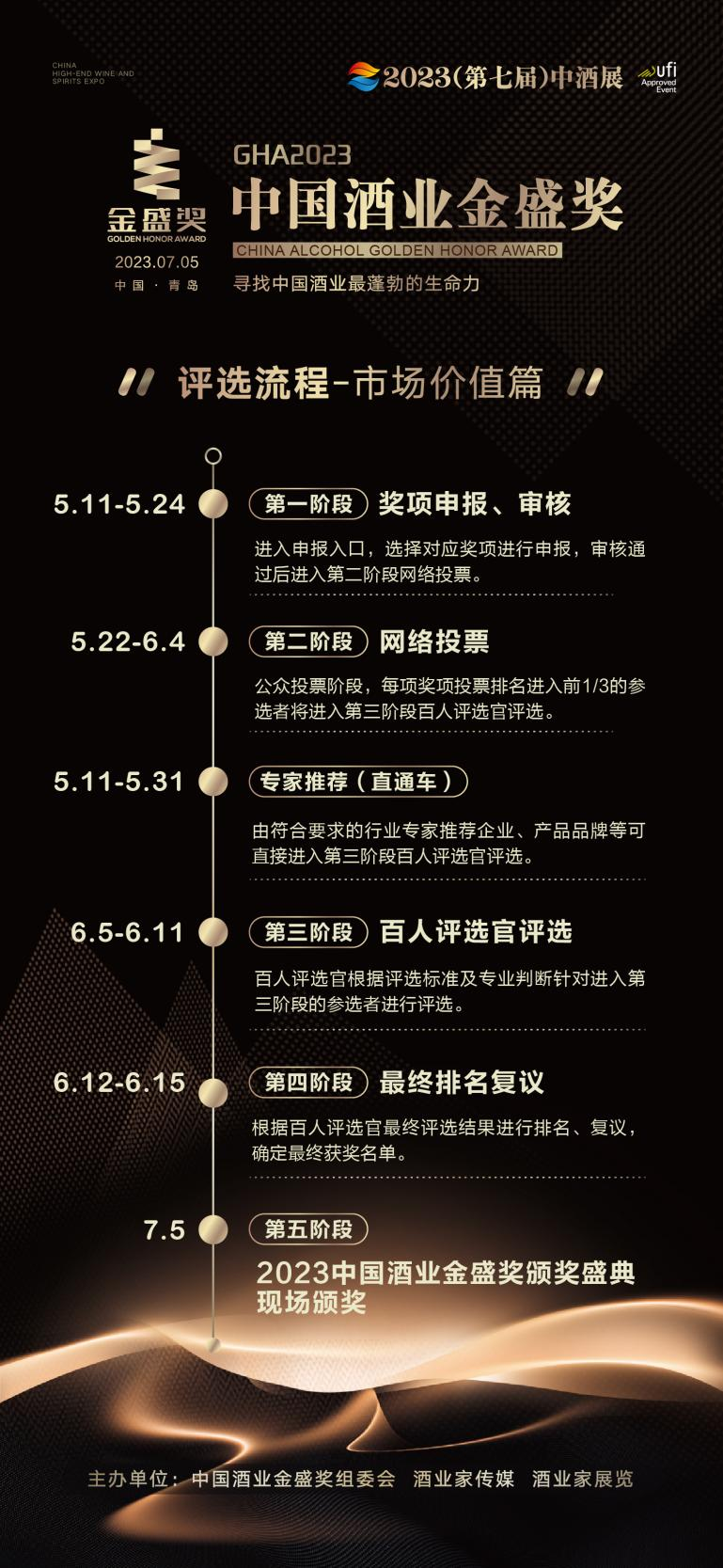 据介绍,2023中国酒业金盛奖的评选,继续秉承专业、客观的原则,其中“市场价值篇”的评选分五大流程,经网络投票、专家推荐、百人评选官评选以及最终排名复议等多个环节。
