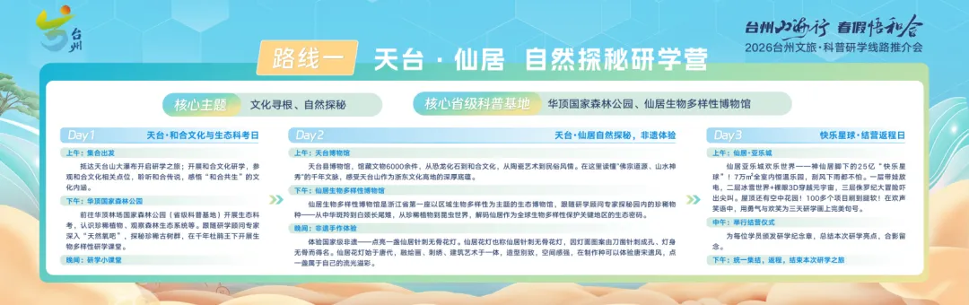 路线一:天台·仙居自然探秘研学营。以“文化寻根、自然探秘”为主线,孩子们将走进华顶国家森林公园探秘古树群落,在仙居生物多样性博物馆近距离观察中华斑羚等珍稀物种,夜晚亲手体验国家级非遗“仙居针刺无骨花灯”,让自然成为最好的老师。