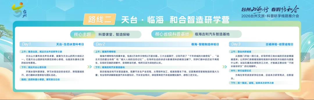 路线二:天台·临海和合智造研学营。以“科普课堂、智造探秘”为核心,孩子们将走进临海吉利汽车智造基地,近距离观摩汽车从零件到整车的智能生产过程,感受硬核科技与工匠精神,再登临台州府城墙,在行走中强健体魄、开阔胸襟。