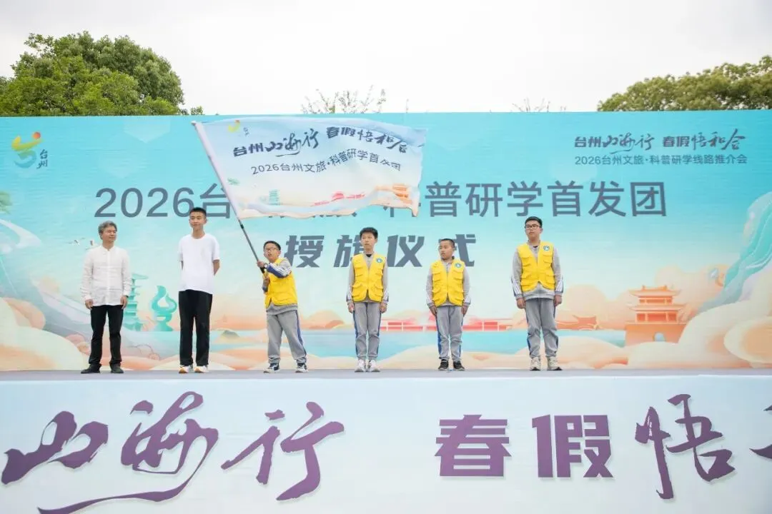 最后,随着与会嘉宾共同按下启动装置,2026台州文旅·科普研学线路正式发布,主办方还为研学首发团举行授旗仪式。