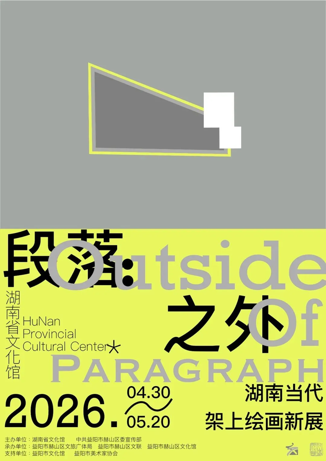 五四青年节到来之际,由湖南省文化馆、中共益阳市赫山区委宣传部主办,益阳市赫山区文旅广体局、益阳市赫山区文联、益阳市赫山区文化馆承办的“段落之外:湖南当代架上绘画新展”,将于2026年4月30日上午10:00在湖南省文化馆开幕。