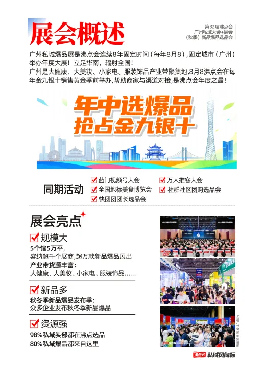 聚焦私域渠道对接、爆品选品、资源互换、流量赋能,广州私域展览会重磅来袭!汇聚全国私域团长、团购平台、渠道经销商、直播达人、品牌方与源头工厂,打造一站式私域资源对接盛会。很多伙伴咨询展会怎么参加、如何报名、参与形式、活动日程,本篇统一整理,干货满满,一键收藏!