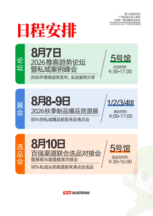 上午:展馆开放入场、品牌展位参观、爆品陈列体验 中午:行业人脉自由交流、商务洽谈 下午:私域行业主题分享会、爆款案例拆解、渠道招商政策宣讲 全天:一对一供需对接、样品洽谈、合作签约、资源互换