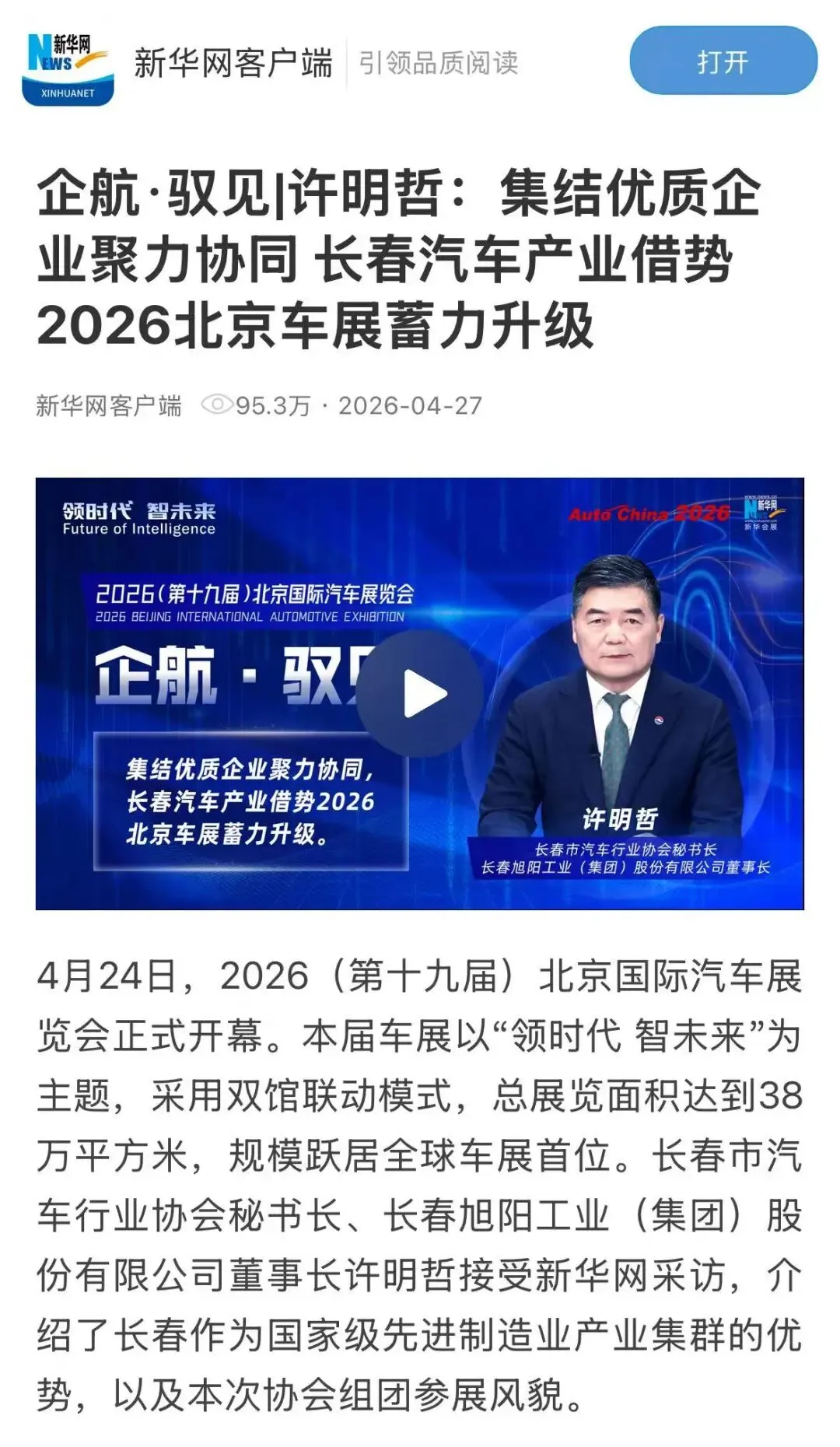 近日,长春旭阳工业(集团)股份有限公司携手长春市汽车行业协会亮相 2026(第十九届)北京国际汽车展览会,集中展示新能源“三电”系统、智能网联等前沿配套技术,获得新华网专题聚焦。同期,吉林省寰旗科技股份有限公司登陆第二十届中国北斗服务商大会,获评“中国北斗交通应用十佳运营服务商”,企业总裁赵琪获评“中国北斗交通应用十年十大杰出贡献人物”。