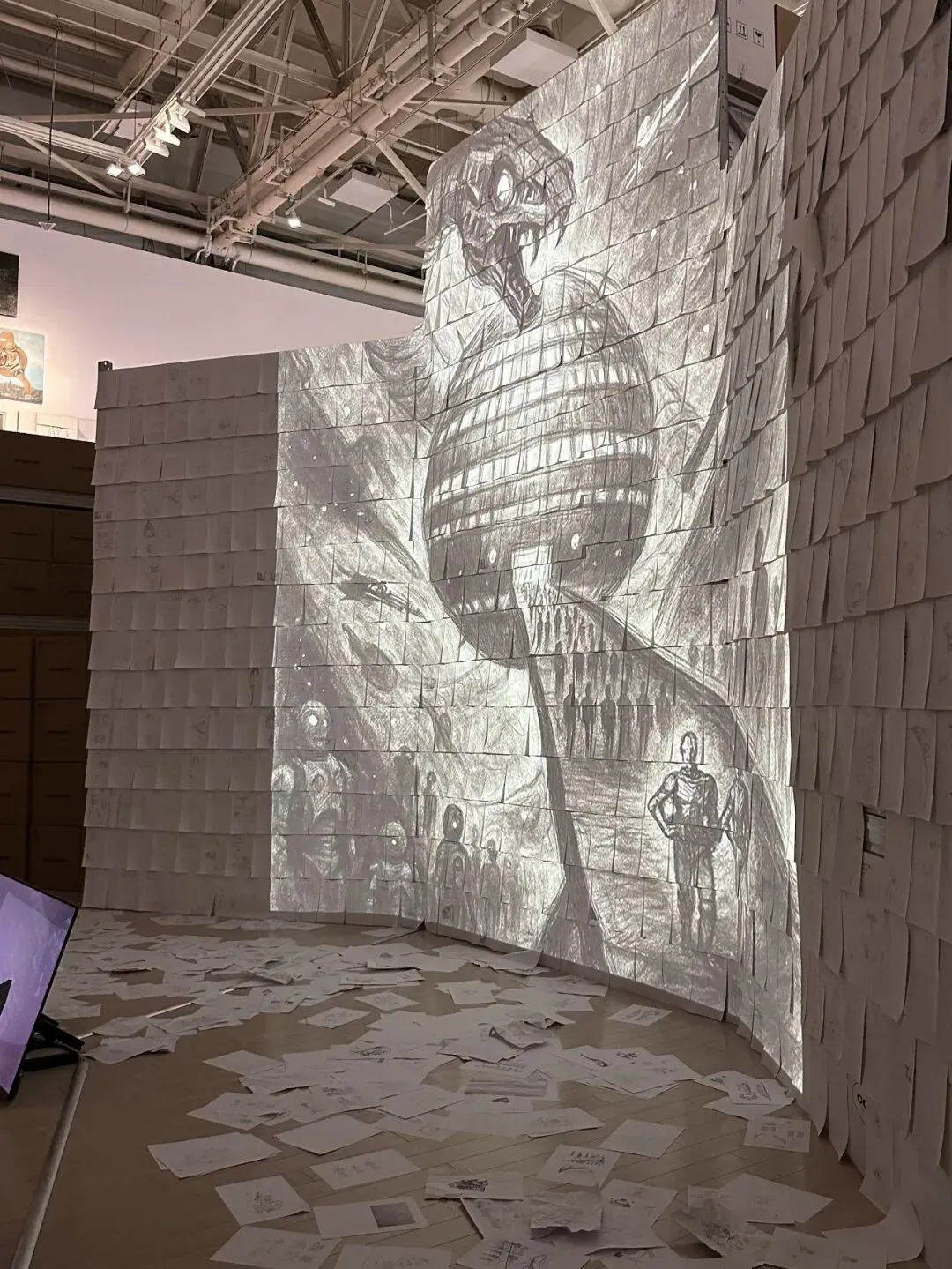 整个展厅被分割成约20个不规则的模块,构建成一个可循环的模块化系统,这正是策展人打破传统‘白墙承载作品’展示逻辑的创新之处——展墙本身也成为艺术家创作的一部分,观众从进入展厅起,便已置身作品之中。