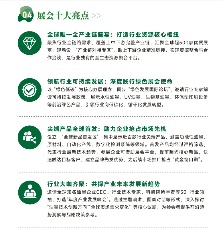 双方将围绕“绿色油墨·多彩世界”的主题,聚焦“高端化、智能化、绿色化”三大转型方向,全面呈现油墨行业在材料创新、工艺升级和设备智能化方面的新成果,并重点展示环保树脂、生物基颜料、功能性添加剂等前沿原材料的研发进展,为产业链上下游企业提供深度对接、共谋发展的宝贵机遇,助力行业在变革中把握先机、共创未来。
