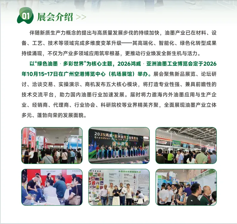 规模预设:40000㎡+ 展览面积、600 + 参展商、30000 + 海内外专业观众、200 + 行业媒体报道、200 + 获奖单位、50 + 战略合作伙伴同期精彩:亚洲油墨产业发展大会、颁奖典礼、油墨之夜、授牌仪式、凹版印刷知识廊云上平台赋能:除了线下展会外,博览会将借助鸿威元宇宙会展获客生态系统 - 云展动力(已沉淀数据 4.1 亿 +),助参展企业数字化贸易升级与全球获客!2026 亚洲油墨展将于 10 月 15 日至 17 日在广州空港博览中心举办。其招商范围涵盖油墨、墨水、材料、设备、技术及服务等多个展区