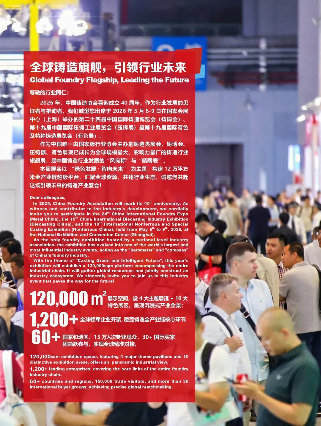 当五月的微风掠过沪上,全球铸造人的目光将再次聚焦上海虹桥。2026年5月6~9日,备受瞩目的第二十四届中国国际铸造博览会、第十九届中国国际压铸工业展览会,将在国家会展中心(上海)拉开帷幕。这将是铸造、压铸及有色合金领域在“马年”奔腾向前的重要节点上,透视产业升级、抢抓市场先机、共绘高质量发展蓝图的绝佳平台。