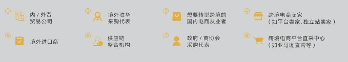 跨境电商供应链展区:家居日用消费品类、3C电子及健康生活类、礼品文具美妆类、鞋服纺织箱包及体育户外类、玩具母婴宠物用品类、家具建材及户外园艺类、五金工具及汽摩配类。