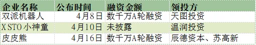 4月初,双派机器人宣布完成数千万元A轮融资,由天图投资领投,国舜投资、西湖科创投等机构跟投;接着在月中,XSTO小神童完成新一轮战略融资,本轮融资由温润投资领投。