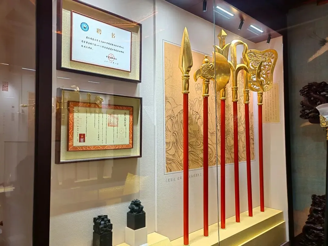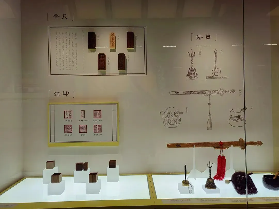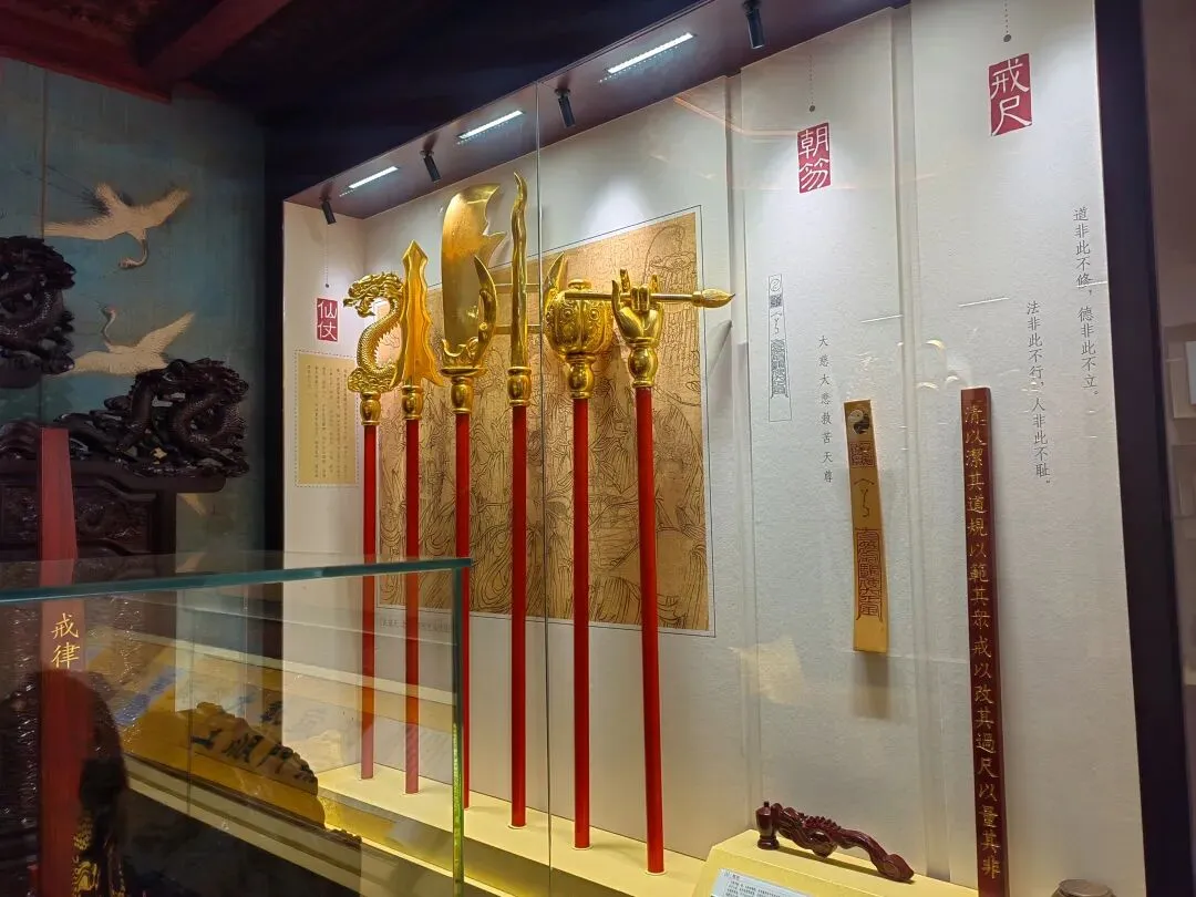 展室通过六大展区呈现传戒仪式的全貌:传戒影像区以照片记录典礼重要场景;传戒服饰区展示方丈法衣、戒衣等仪式服饰;道教经典与戒经展区陈列重要典籍;道教法器展区展出法印、神符、钵、磬等仪式器物;道教礼仪视频区通过影像演示日常礼仪;方丈法座区再现法座及香案陈设。