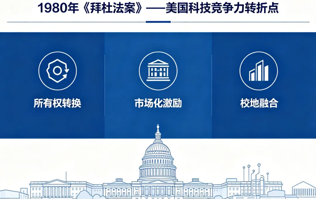 根据相关研究,1980年《拜杜法案》的通过是美国科技竞争力的重要节点。其核心逻辑在于“所有权的范式转换”: