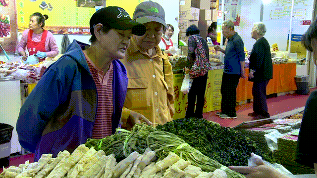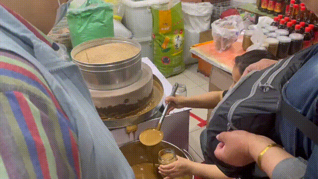 市集就是有一种自来熟的魅力,来这儿的人都会互相盘问盘问;谁家的菜新鲜?哪家的肉好?只要这口碑传出去,就不怕没有上门儿排队的。您瞧大姐这麻酱一瓶接一瓶的!