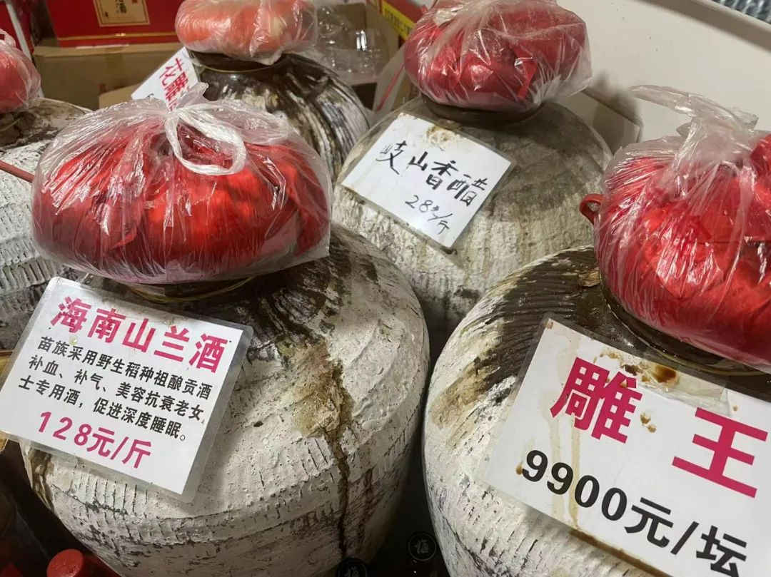 这几坛子手工醋吸引了不少顾客,有枸杞醋、老陈醋...看标签都是有年头的了,打老远在拐角处就能闻到。