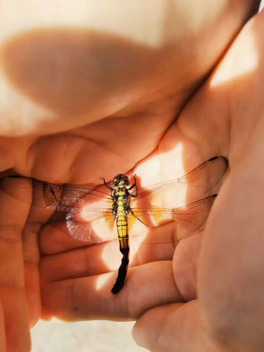 阳光下,蜻蜓伏于掌心,翅膀的格纹与掌纹肌理恰好重叠,形成了自然造物间巧合的呼应。
