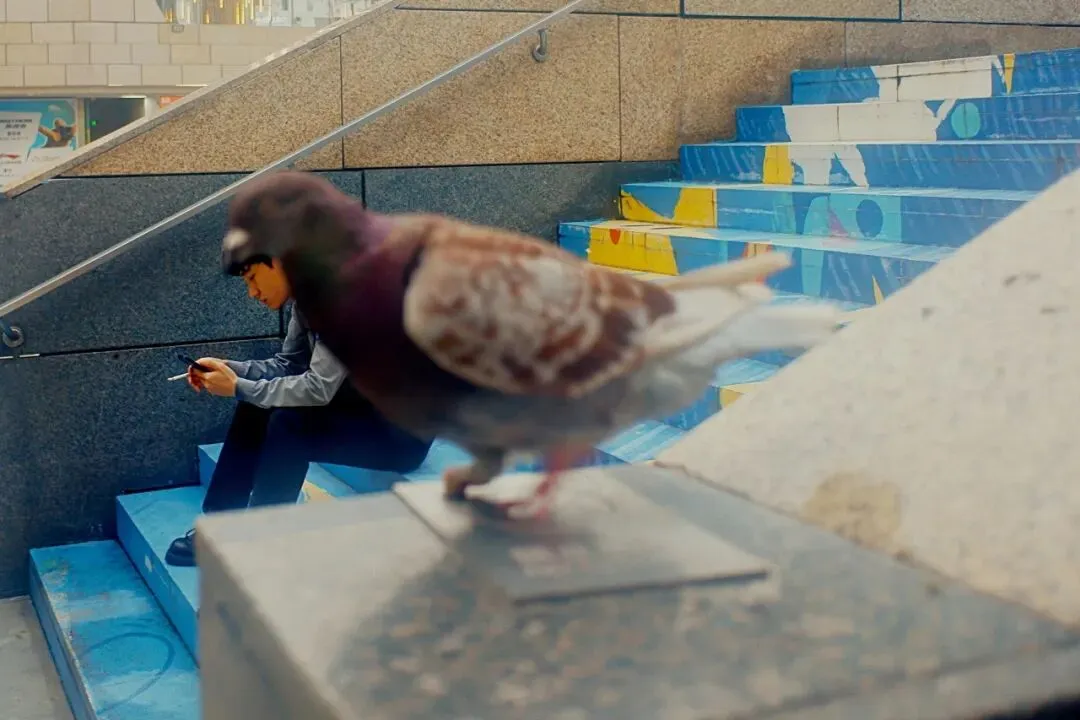 雨后的夏日傍晚,商业城内的台阶上,一只鸽子和一位男子,不期而遇地跳进了相机。香烟、手机、人和鸟,他、它和我的一瞬间,彼时和此刻,一起暂停,平等而平衡。想起几句歌词,“人们不该去羡慕飞鸟,世界比我大,把自我缩小”。飞鸟会羡慕我们吗?
