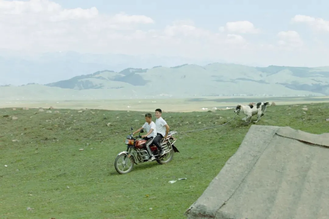 那拉提草原上摩托少年与狗,自由得像风。