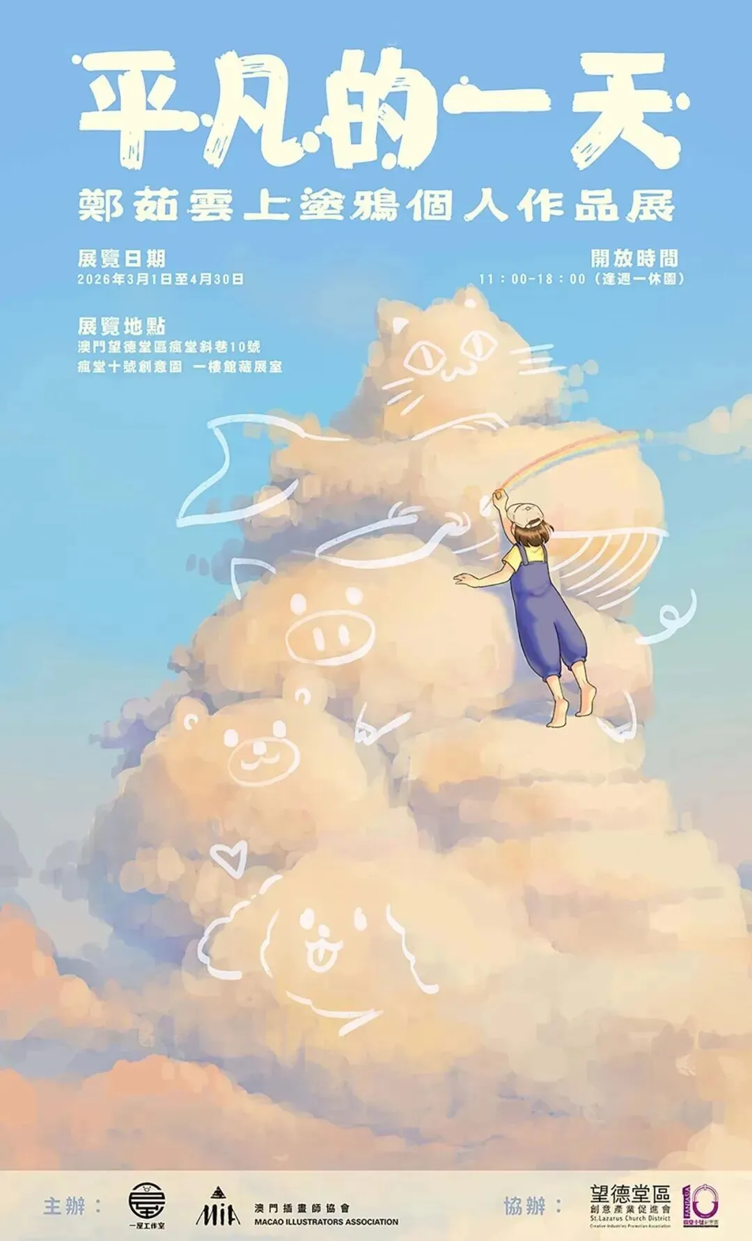 艺术家郑茹擅长治愈系插画,在这次个人作品展中与观众分享她眼中看到的云朵,以及藏在云朵里的可爱小动物和人儿。