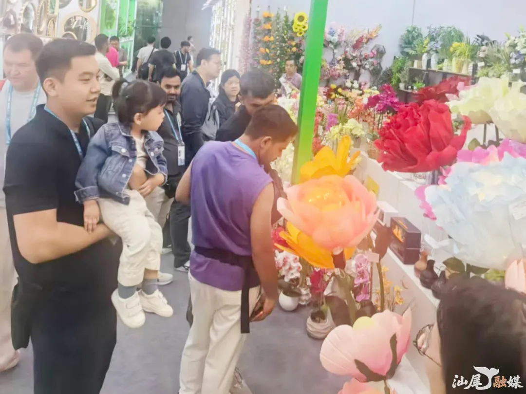 记者刚来到陆丰市永盛工艺品有限公司(以下简称“永盛”)的展位,就被一丛自动开合的人造大花吸引了目光,其花蕊顶部巧妙地点缀了微小的米黄色灯芯,让花朵绽放时透着点点星光,如梦似幻。